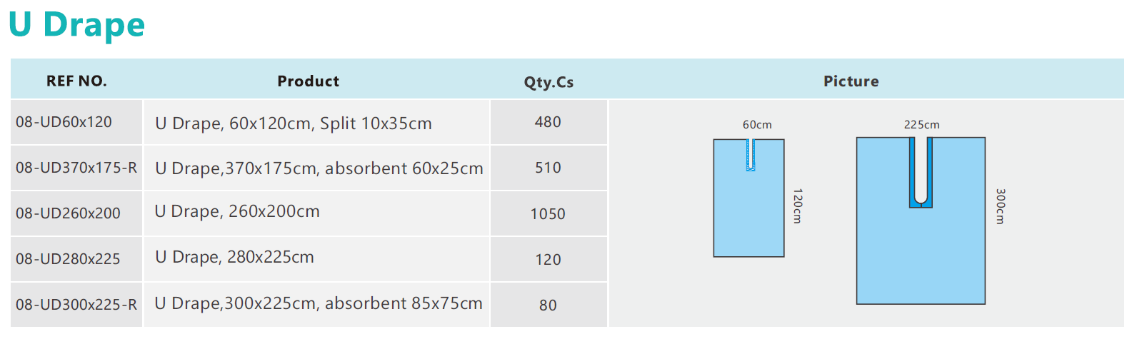 U-shaped slit hole towels are mainly used for orthopedic surgery, mainly for covering the underarms, head, buttocks, and so on; Common sizes are 160x200cm, 175x270cm, 200x270cm, 220x300cm, and other customized models.